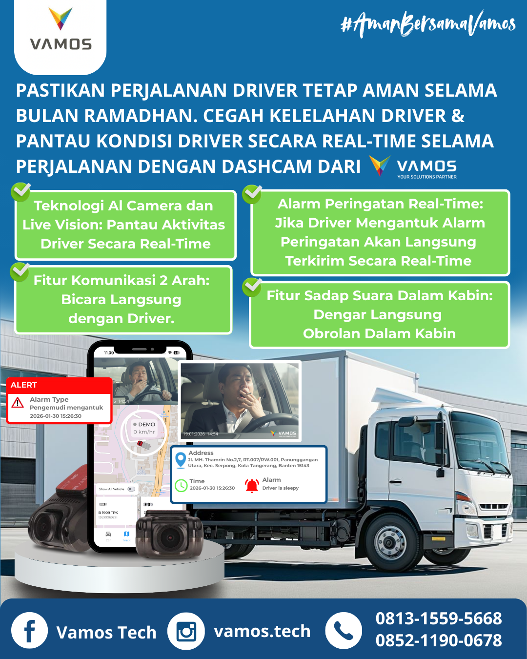 Optimalkan keamanan dan produktivitas armada selama bulan Ramadhan dengan Dashcam VAMOS. Pantau kondisi driver secara real-time, cegah microsleep, dan dapatkan alarm peringatan otomatis untuk perjalanan yang lebih aman dan terkendali.