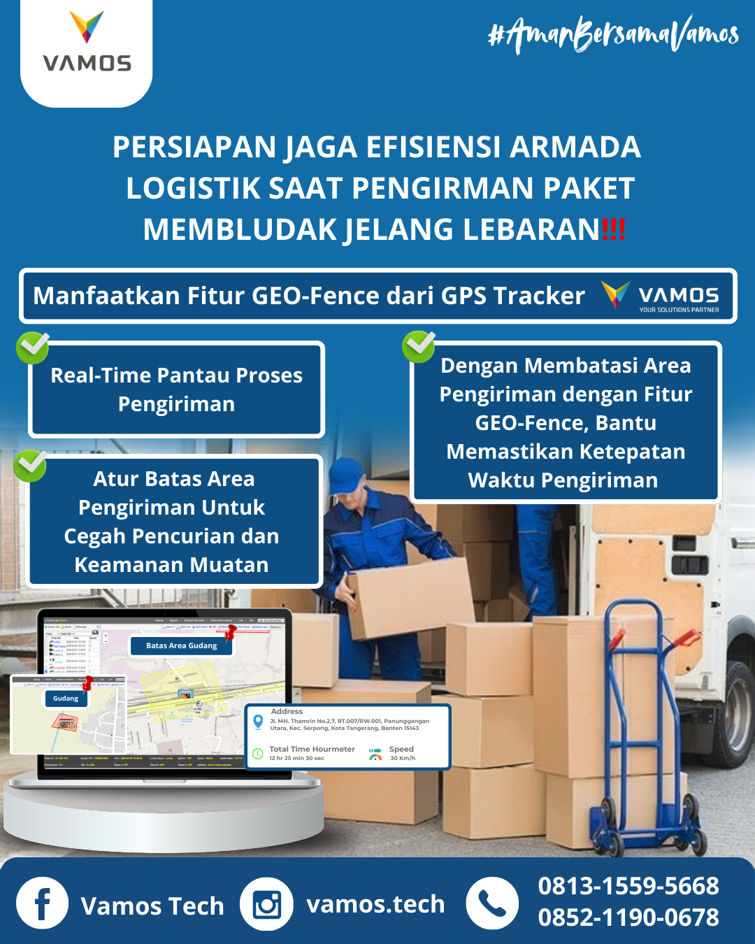 Optimalkan efisiensi armada logistik saat lonjakan pengiriman paket jelang Lebaran dengan fitur GEO-Fence dari GPS Tracker VAMOS. Pantau real-time, cegah pencurian, dan pastikan ketepatan waktu pengiriman secara maksimal.